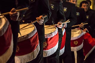 Percusión, se mantiene más o menos la estructura inicial: caja, tambor y timbal, con la incorporación de los platos. Conviene reseñar que, aunque la estructura es la misma, la evolución instrumental ha variado. Se ha pasado de los tambores y timbales de cuerpo de madera y parche de tripa, a los que se emplean en la actualidad.