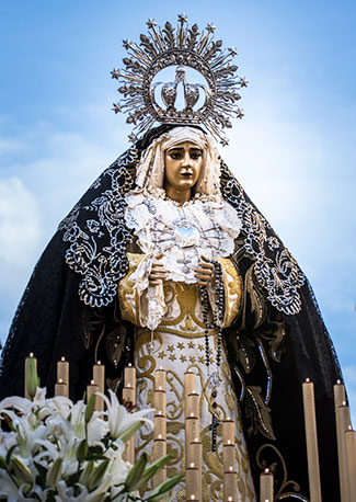 La imagen de la Virgen de la Soledad fue realizada en el taller madrileño del escultor D. Víctor González Gil, natural de Talavera de la Reina. Su estilo es el de una imagen dolorosa de candelero para vestir donde solo se tallan cabeza y manos. Este escultor realiza en el año 1954 la canastilla en madera tallada y dorada del trono procesional según el modelo que se le facilita, por fotografía, del trono de la Magdalena de Andújar, en la provincia de Jaén.