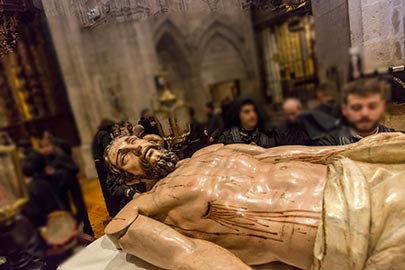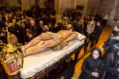 La imagen fue restaurada durante el verano del 2000 por D. Luis Cristóbal Antón. La cofradía procesiona la tarde del Viernes Santo tras el sermón del descendimiento (representación que recuerda los autos sacramentales del siglo de oro), la ceremonia se lleva a cabo en el altar mayor de la iglesia de Santa María, y a las indicaciones del predicador, dos cofrades, llamados "santos varones" van desclavando y descendiendo a Cristo de la Cruz, mientras otros dos lo reciben en el suelo para colocarlo en las andas procesionales a modo de Santo Sepulcro. Cuando en el año 1950, se intenta revitalizar la Semana Santa, con la creación de nuevas hermandades, la procesión del Santo Entierro se ve engrandecida con el acompañamiento de todas ellas. Como anécdota decir que, según los programas de actos, los años 1956 y 1957 el sermón se celebró en la Plaza Mayor, pero las inclemencias del tiempo (un fuerte aguacero obliga a suspender el sermón y realizarlo al día siguiente) aconsejaron volver a celebrarlo en la parroquia, a excepción del año 1961 que vuelve a celebrarse en la Plaza Mayor por estar en obras Santa María.