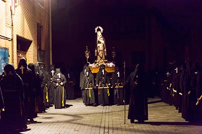 Cuenta con banda de tambores y cornetas propia; su hábito es el más antiguo de todos los que se lucen, ya que la cofradía ha conservado el estilo que tuvo desde sus inicios, consta de túnica y capuchón negro, cíngulo amarillo y rosario de grandes cuentas de madera anudado al cíngulo, zapatos y guantes negros, en la esclavina del capuchón, delantera y trasera, el emblema de la cofradía, una cruz blanca en tela aplicada; se alumbran con cirio de cera y no celebran fiesta anual.