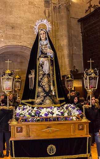 Finaliza sus citas diciéndonos que "... En el año 1816 deseando los Hermanos de la Cofradía del Entierro de Cristo restablecer la antigua ceremonia del Descendimiento, y habilitada ya para el culto la iglesia de San Francisco, solicitaron del Sr. Obispo licencia para ello. Fueles concedida, mas con la expresa condición de que quedase inválida desde el momento en que se cometiesen abusos en meriendas y comilonas, y de que terminase la procesión antes de anochecer. Parece que ya en este tiempo era costumbre de celebrar por la noche la procesión de la Soledad, que en estos años de anomalía salió de la parroquia de San Juan...". El convento de San Francisco, donde residía la cofradía, fue incendiado durante la invasión de las tropas francesas, que lo utilizaron como cuartel, en el año 1808, salvándose la imagen pero perdiéndose toda la documentación y libros de la cofradía; con la desamortización de 1856 el convento es abandonado pasando definitivamente a la parroquia de Santa María la Real hasta nuestros días.