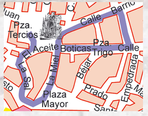El Aceite, La Sal, Plaza Mayor, La Miel, Barrionuevo, Josefina Arias de Miranda, Isilla, Plaza del Trigo, Las Boticas y Plaza de Santa María.