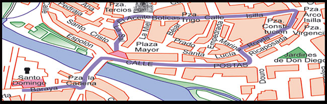 Plaza Mayor, (donde cruzará bajo el arco del Ayuntamiento para salir al puente sobre el Duero) y Ruperta Baraya.