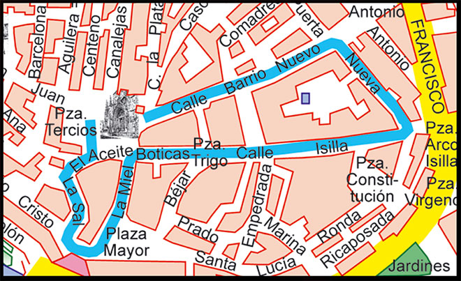 Plaza de Santa María, El Aceite, La sal, Plaza Mayor, La Miel, Las Boticas, Plaza del Trigo, Isilla, Puerta Nueva, Barrio Nuevo y Plaza de Santa